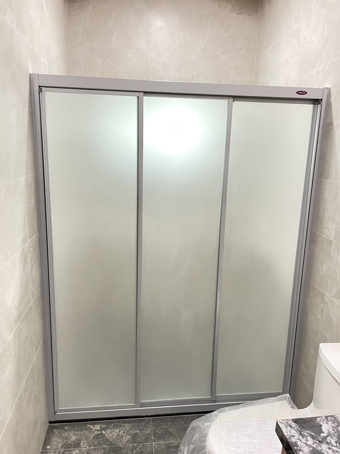 規格介紹(4)拉門型式:一字三門(橫拉)材 質:5mm不沾手噴砂玻璃型 式:一字型烤漆顏色:銀珠色